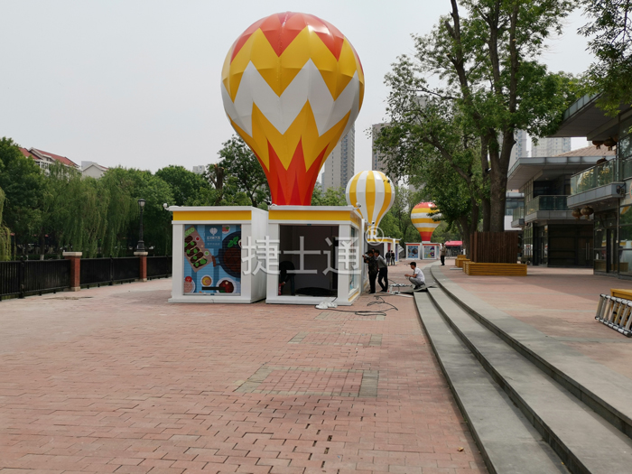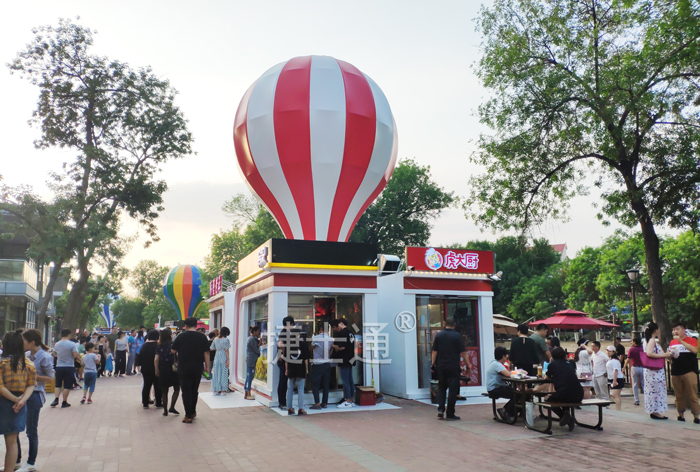 此款售貨亭 也被稱(chēng)為商亭,商亭是現(xiàn)代建筑的一個(gè)詞匯,顧名思義“商”作為商業(yè)交易來(lái)應(yīng)用,亭作為一種建筑詞匯;售貨亭外型氣球造型新穎,吸引游客,從而對(duì)美食產(chǎn)生不可控之情;