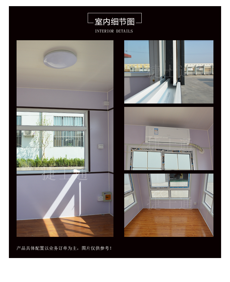 標(biāo)準(zhǔn)配置 : 墻體含保溫材料,屋頂鍍鋅板靜電噴涂,PVC吊頂,地板可定做防滑鋁板,電箱、開關(guān)、工作臺、插座、暗敷電線、照明燈、桌面、抽屜、鍵盤托、空調(diào)架等。可加配:空調(diào)等。