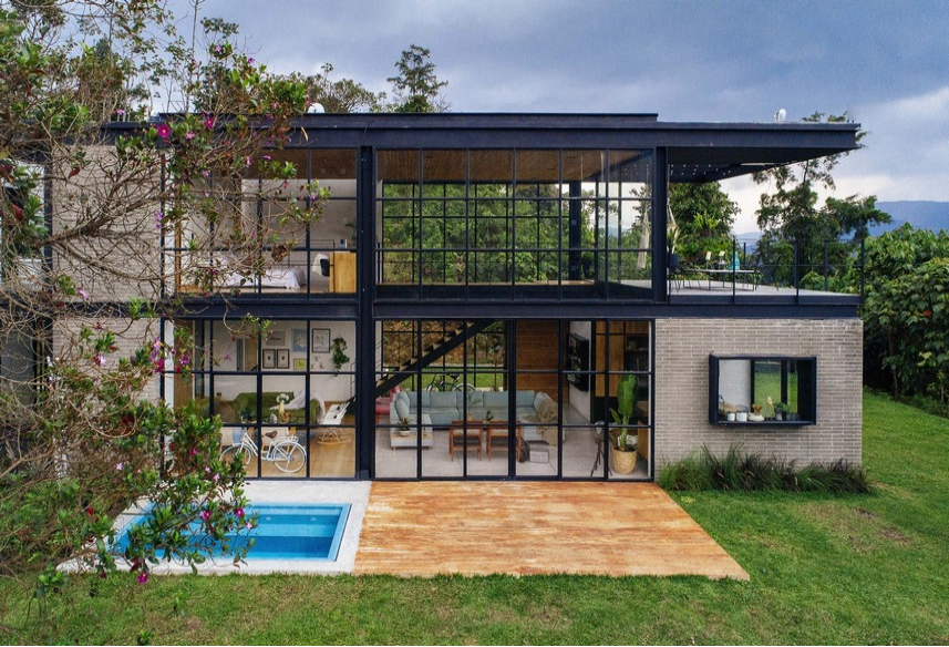 這個釉面金屬結(jié)構(gòu)集成房屋有兩個水平的地板,被真空攔截,房子的空間朝向這個樓層。沒有墻壁,