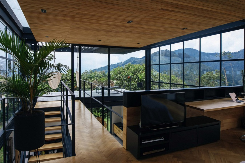 穿過*空隙的小型金屬結(jié)構(gòu)橋?qū)⑴P室與一個帶頂棚的露臺連接起來,露臺占據(jù)了周圍的自然景觀。