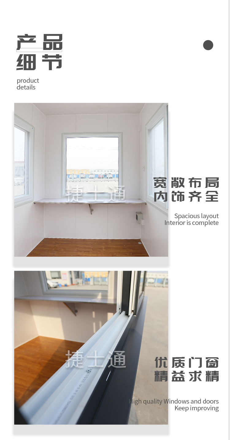 其他標準配置:墻體含保溫材料,屋頂鍍鋅板靜電噴涂,PVC吊頂,地板可定做防滑鋁板,電箱、開關(guān)、插座、暗敷電線、照明燈、桌面、抽屜、鍵盤托、空調(diào)架等