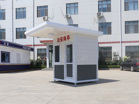 此款治安崗亭應客戶需求,在崗亭上方多延伸一處帽檐,起到一個遮陽避雨的功效,崗亭整體外圍尺寸為2*3米,其中崗亭和帽檐分別為1.5米,相當于為執(zhí)勤人員提供一個便捷的戶外執(zhí)勤站崗亭