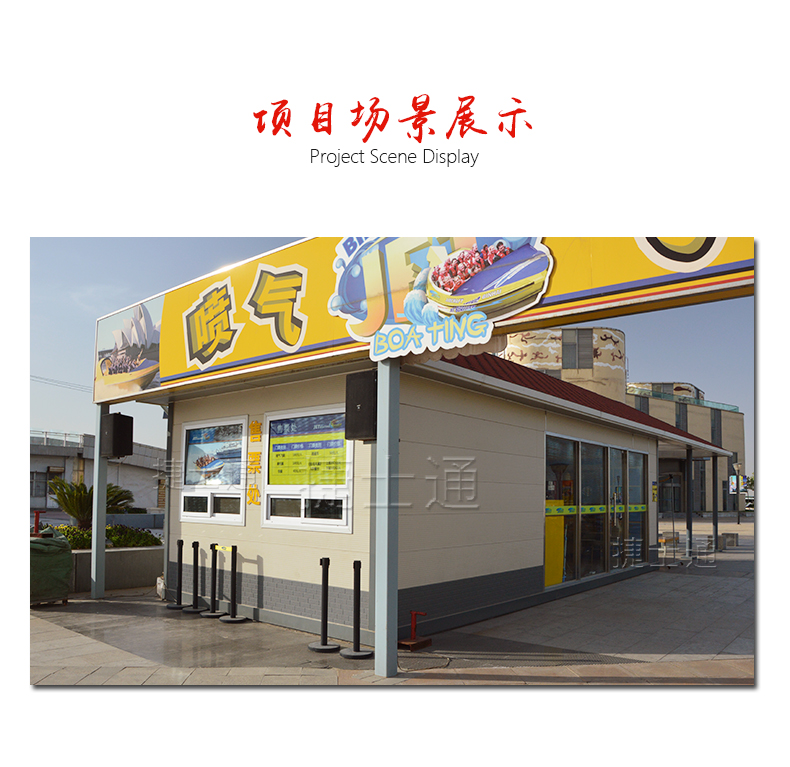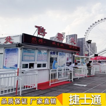 標準配置:墻體含保溫材料,屋頂鍍鋅板靜電噴涂,PVC吊頂,室內(nèi)地板可定做防滑鋁板,電箱、開關、插座、暗敷電線、照明燈、桌面、抽屜、鍵盤托、空調(diào)架等。推拉窗多個窗口,方便與游客溝通。