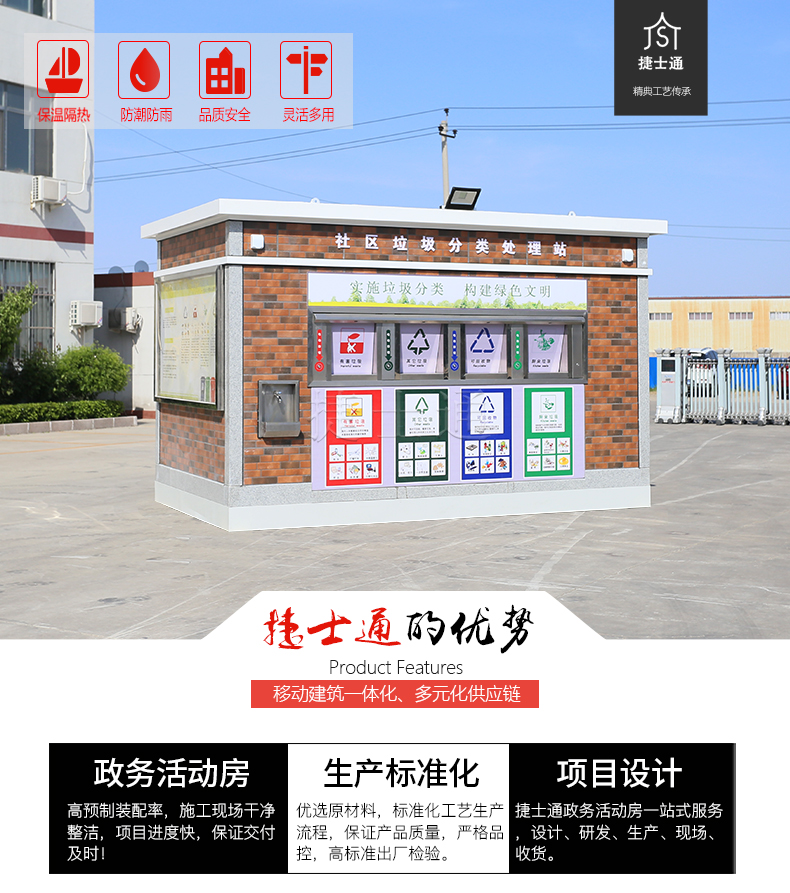 捷士通生產(chǎn)的主要是環(huán)保分類(lèi)垃圾房和大型垃圾房。大型垃圾房廠家,擁有多條垃圾房產(chǎn)品線,垃圾房?jī)?nèi)部配備各種技能技術(shù)和*技術(shù),在垃圾房領(lǐng)域占有制高點(diǎn)。