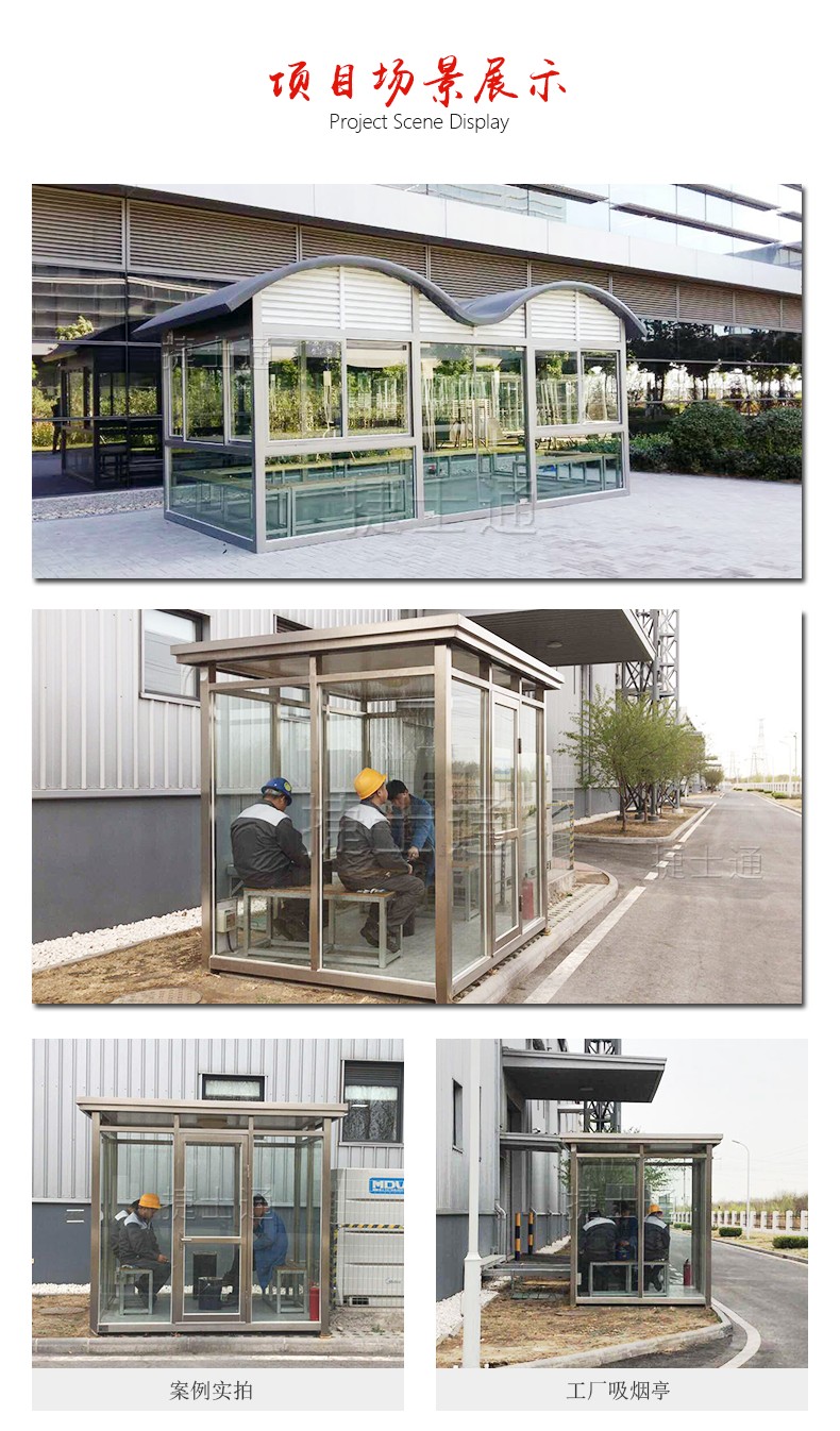 天津捷士通吸煙崗?fù)は盗?;吸煙亭常?guī)結(jié)構(gòu)以不銹鋼管及鍍鋅鋼管作為框架,再加上鋼化玻璃為外觀。外觀時尚現(xiàn)代,內(nèi)部舒適便捷;優(yōu)勢在于防火,排風(fēng),聲光控制燈光,可移動,配有吸煙桶及座椅;室外及室內(nèi)可移動吸煙亭既解決了安全及環(huán)境問題,也解決了員工抽煙的過渡問題,是企業(yè)單位的優(yōu)選擇。