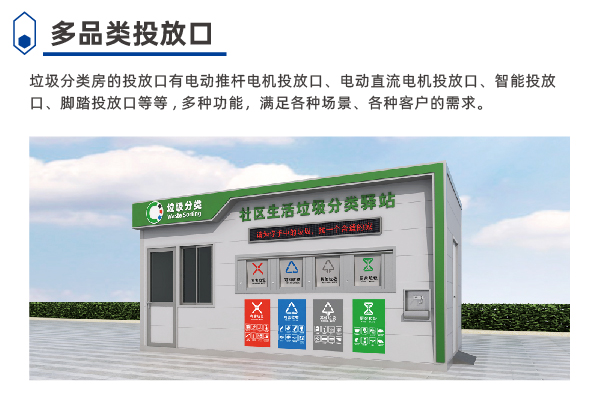 4、多品類投放口:垃圾分類房的投放口有電動推桿電機投放口,電動直流電機投放口,智能投放口,腳踏投放口等等,多種功能,滿足各種場景,各種客戶的需求