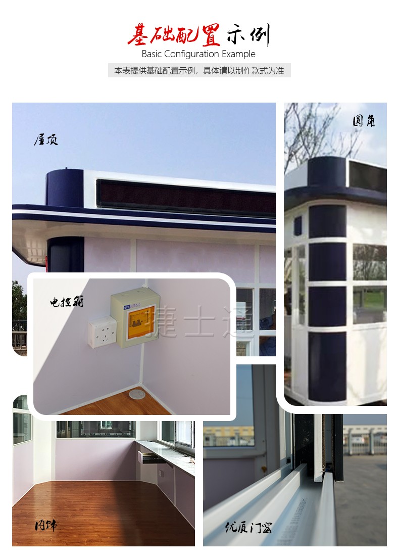 外表面:優(yōu)質(zhì)浮雕飾面金屬板,底座:鋼龍骨架40*40*2.0(厚),中層:18mm防水模板,地板:3mm防滑耐磨鋁地板,門:定制鋼結(jié)構(gòu)門